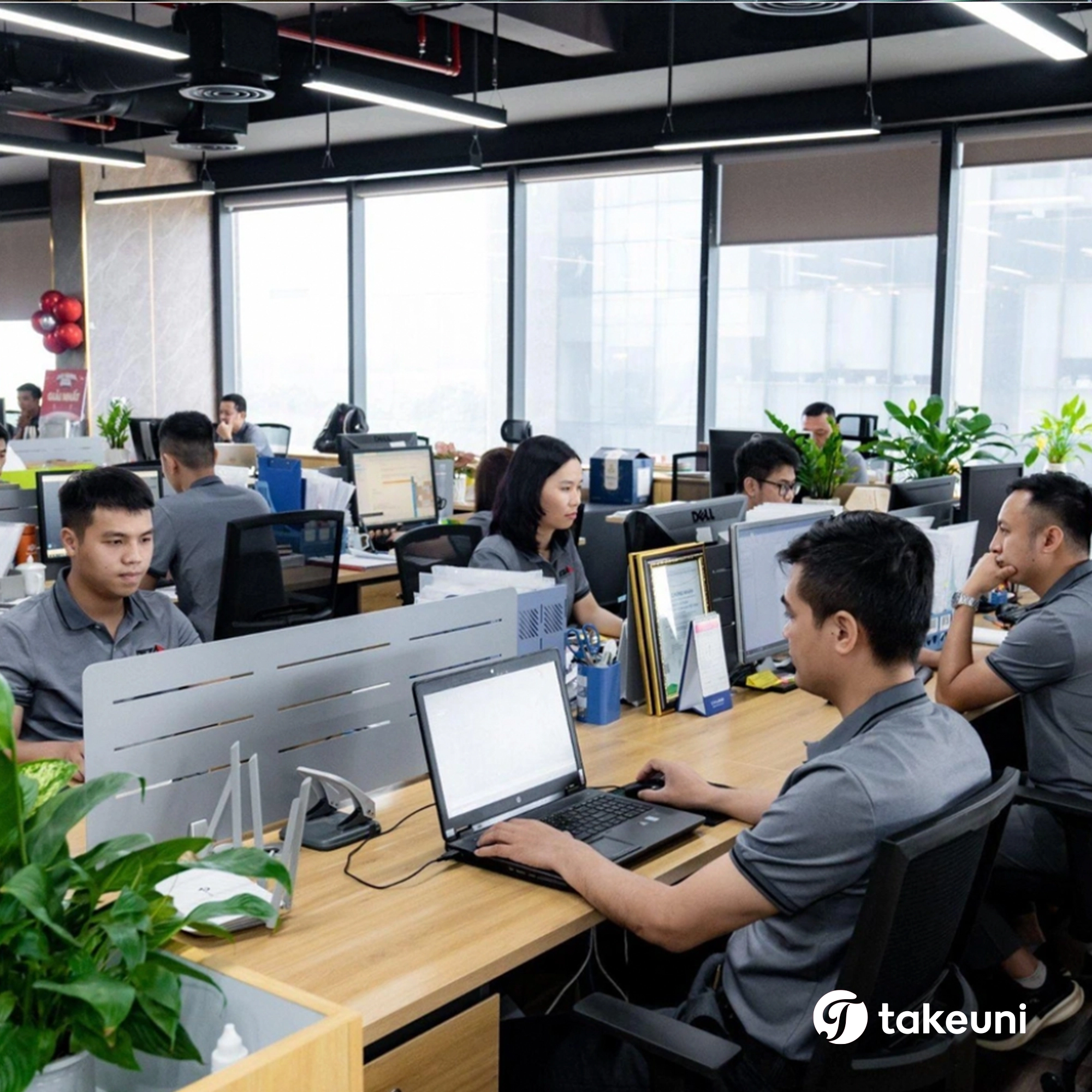 - TakeUni tư vấn chất liệu bền – đẹp – chuẩn nhận diện, phù hợp tính chất công việc (văn phòng, bán hàng, logistic, F&B…).