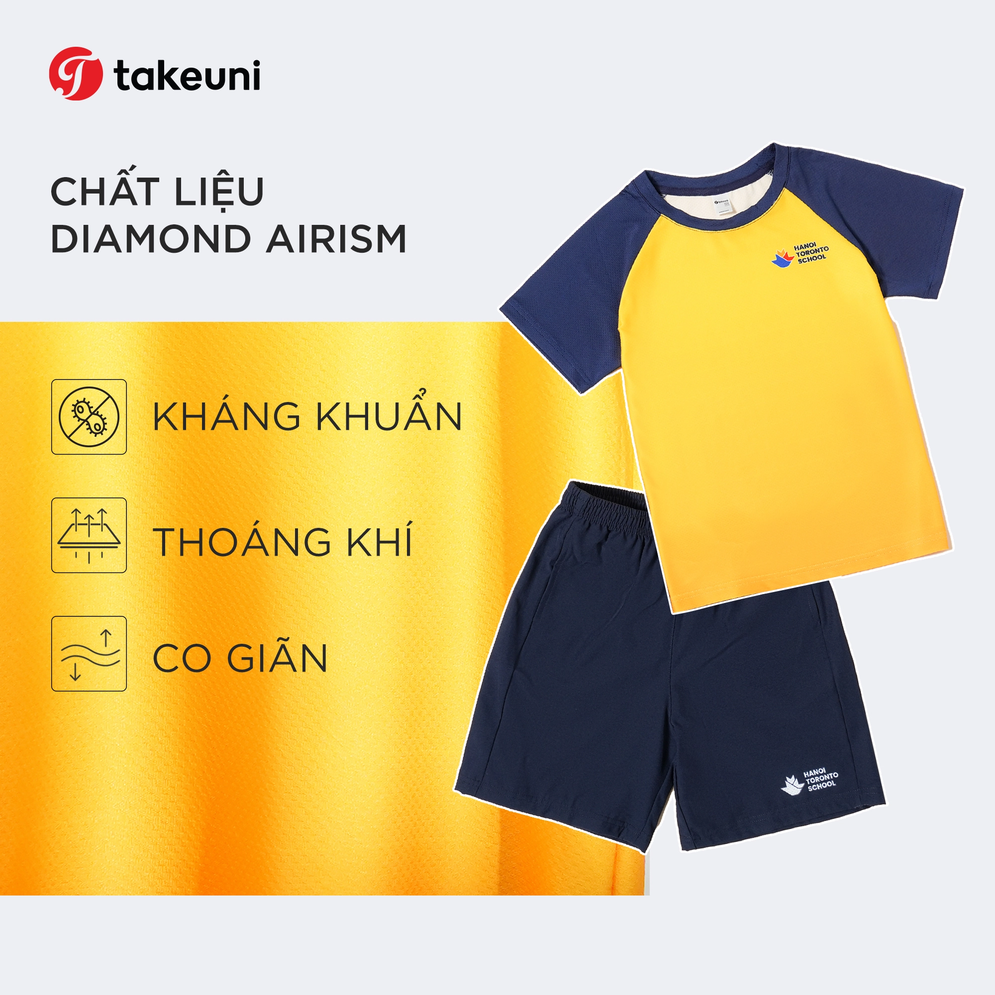 Dẫn đầu trong xu hướng vải công nghệ tại TakeUni là Diamond Airism. Đây được coi là “cứu cánh” cho học sinh trong những giờ giáo dục thể chất năng động (PE).