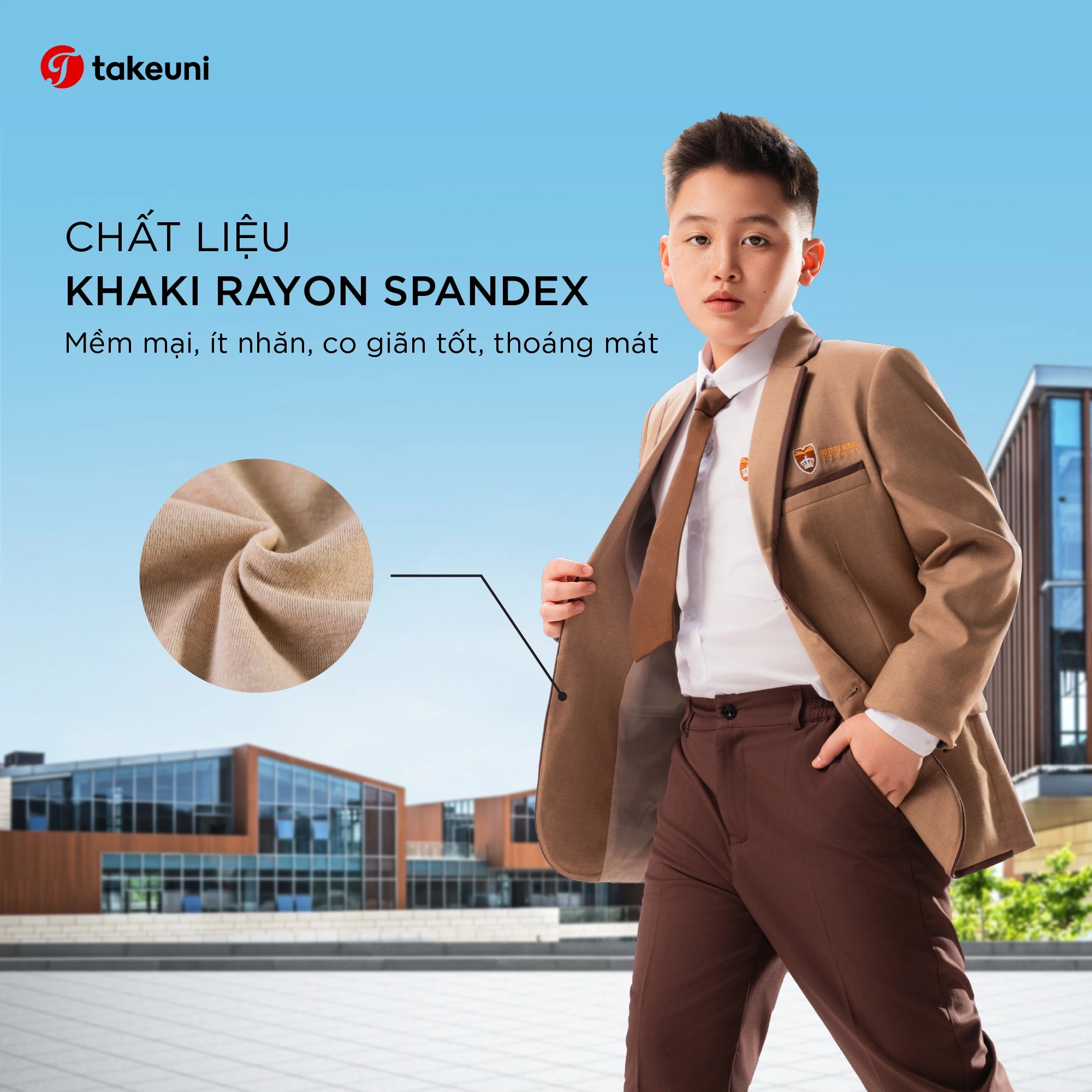 - Thiết kế nhân trắc học: TakeUni kết hợp chất liệu co giãn với đường cắt may tinh tế, giúp học sinh thoải mái tối đa trong mọi cử động.