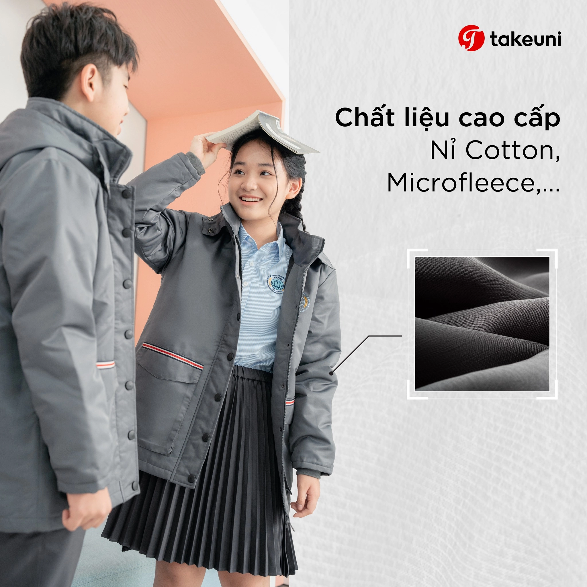 Vào mùa lạnh, học sinh thường gặp tình trạng “ngoài lạnh trong nóng” do chạy nhảy nhưng áo khoác lại quá bí bách. TakeUni mang đến dòng chất liệu đồng phục nỉ chân cua cao cấp: