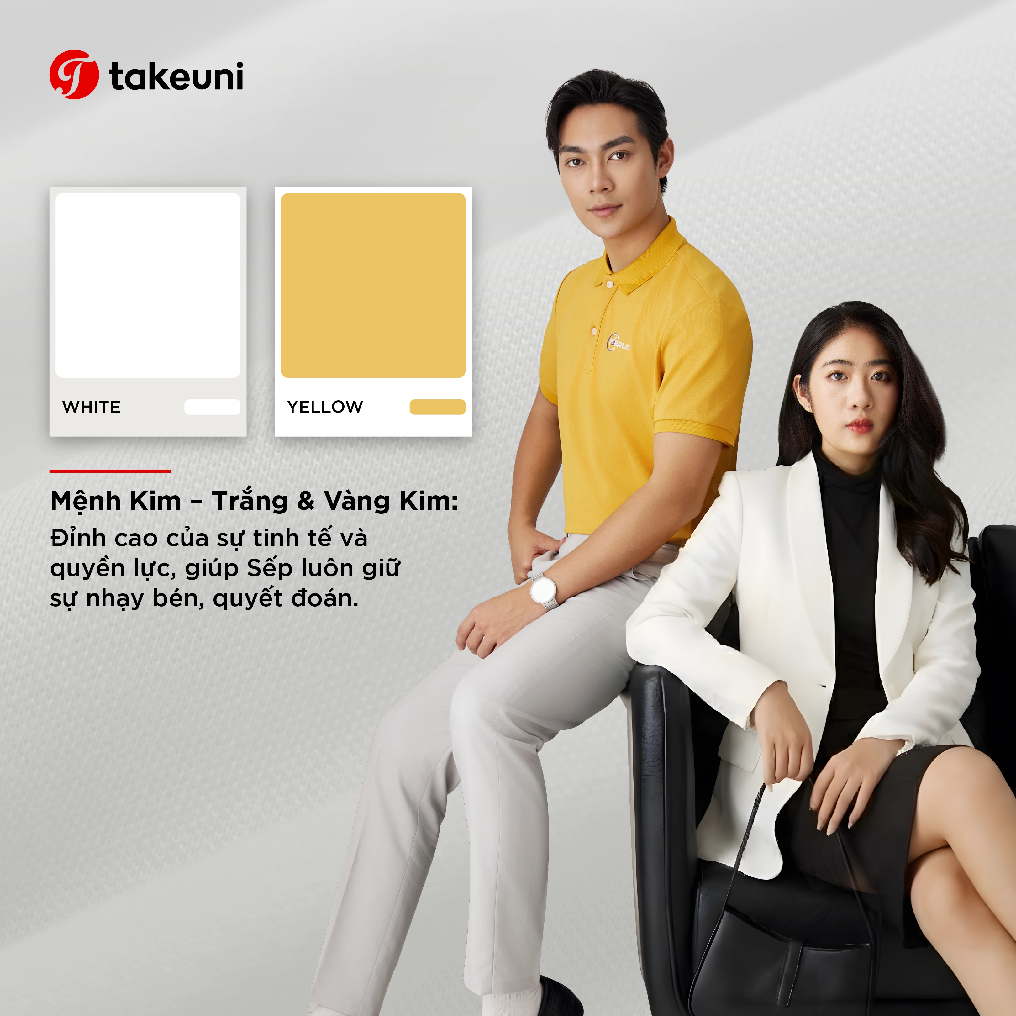 Màu trắng và vàng kim là biểu tượng của sự tinh khiết, minh bạch và giàu sang. Lựa chọn màu đồng phục này giúp Sếp mệnh Kim luôn giữ được sự nhạy bén trong kinh doanh và phong thái quyết đoán trước những dự án lớn. Đây cũng là gam màu dễ dàng tạo được sự tin tưởng về tính chuyên nghiệp trong mắt đối tác.